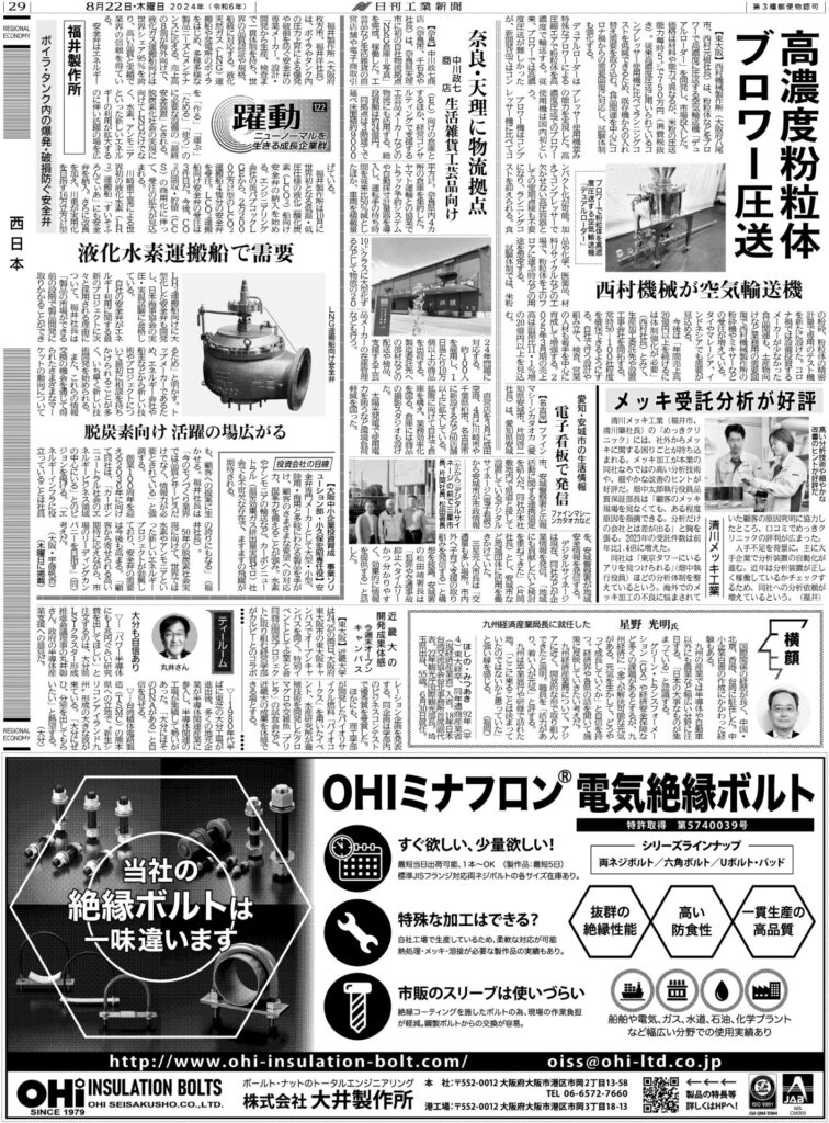 日刊工業新聞「高濃度粉粒体ブロワー」に掲載されました(2024.8.22)