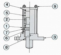 (2)三方電磁弁に通電すると圧縮空 気(3~5kg/cm³)が電磁弁をとおり、クイックエキゾストバルブを経てエアーノッカー(エアーハンマーショッカー)本体に流入され、圧力が高まり、スプリングを押し上げる。