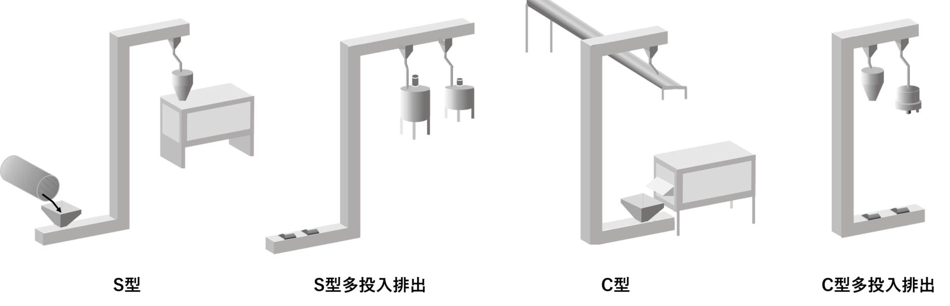 ・下部水平部・垂直搬送部・上水平部・供給口や排出口の位置・数など、レイアウトに応じて設計可能です。
