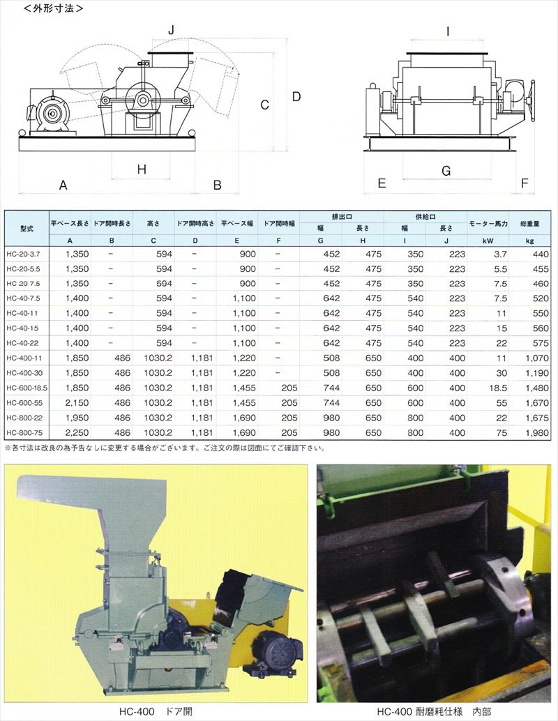 【HC型】ハンマークラッシャー(粗砕機)型式・サイズ・図面